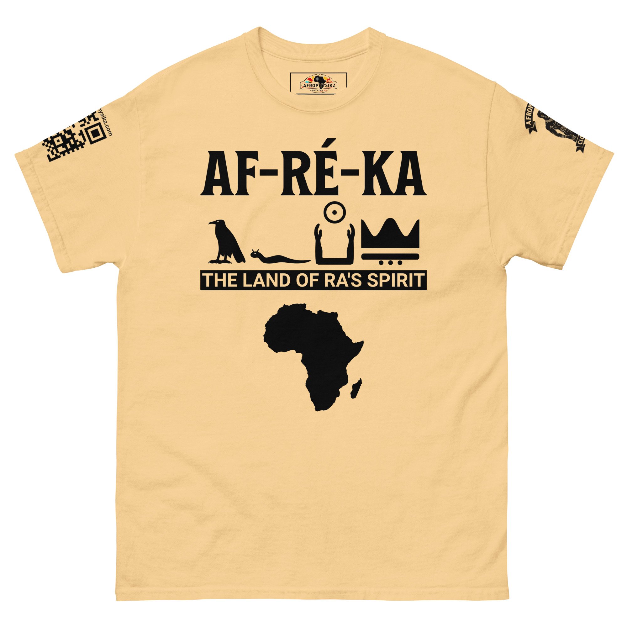 Introducing the Af-Ré-Ka t-shirt. A modern reinterpretation of the word Africa, designed using the ancient Medu Neter (Egyptian Hieroglyphic) script, that not only phonetically sounds out the word, but also give it a divine and applicable meaning, which translates to "THE LAND OF RA'S SPIRIT", as an acknowledgement of the divine energy bestowed by the sun on the land and its people.